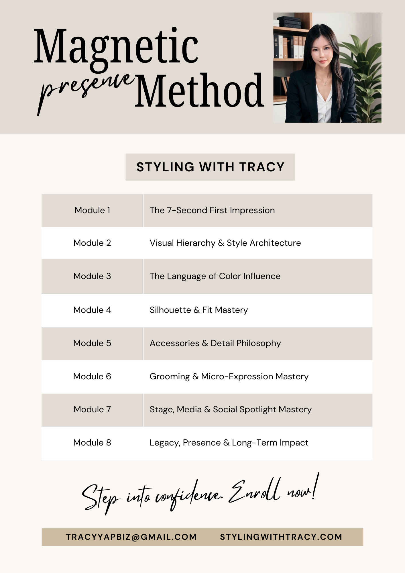 An 8-module online program that gives you a repeatable system to master first impressions, style, color, fit, grooming, and stage presence.